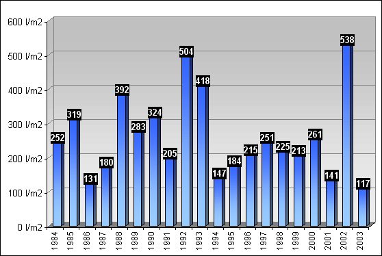 Durant els últims 20 anys la mitjana de precipitació a Banyoles del període abril-maig-juny-juliol és de 265 litres per metre quadrat. Durant aquest període de l'any 2003 s'ha recollit a la nostra ciutat la ridícula xifra de 117 litres/m2. Aquesta insuficient quantitat representa només el 44% de la pluja habitual de Banyoles durant aquest període concret.